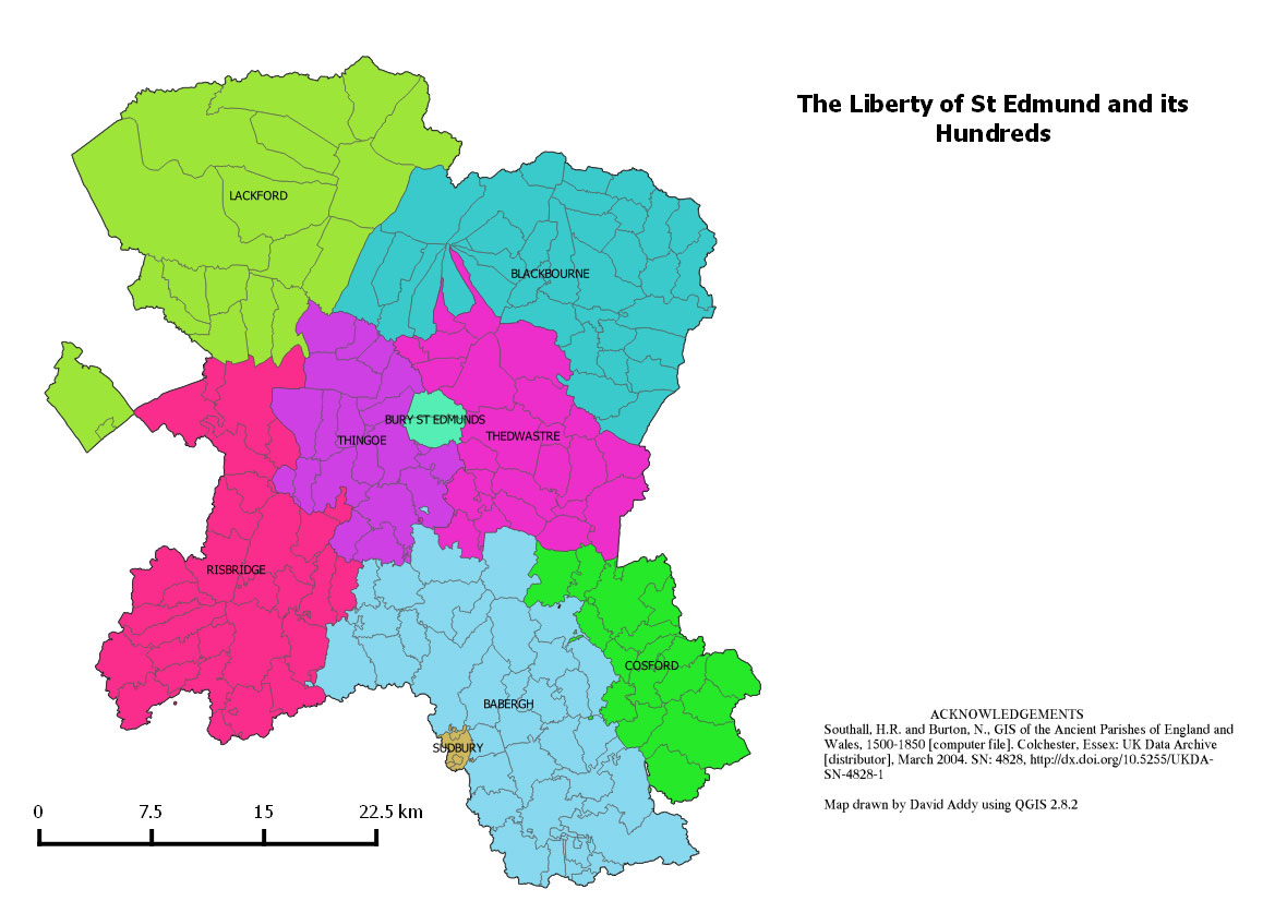 By consulting the Historical Atlas of Suffolk, it is possible to pick out those parishes within the various Hundreds as they existed in the 19th century. The Liberty area persisted as West Suffolk County Council until 1974.
