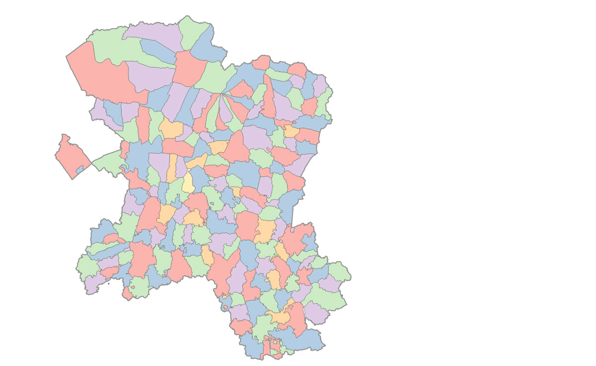 This example of a map produced within QGIS shows the area of the Liberty of St Edmund as it was in the mid 19th century. The individual parishes are coloured in such a way that, using the minimum of colours, no adjacent parishes bear the same colour.
