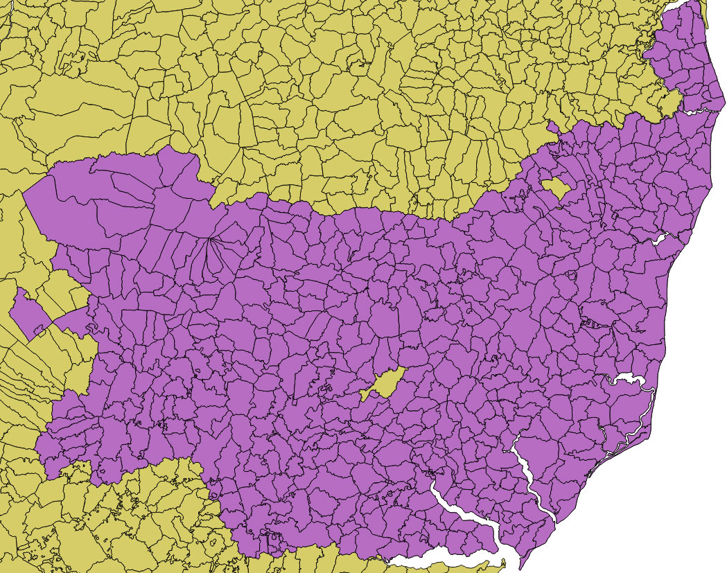 We now have to edit the original ESDS layer (in yellow) by copying the polygons that show through, and then pasting these into our Suffolk layer (in purple).