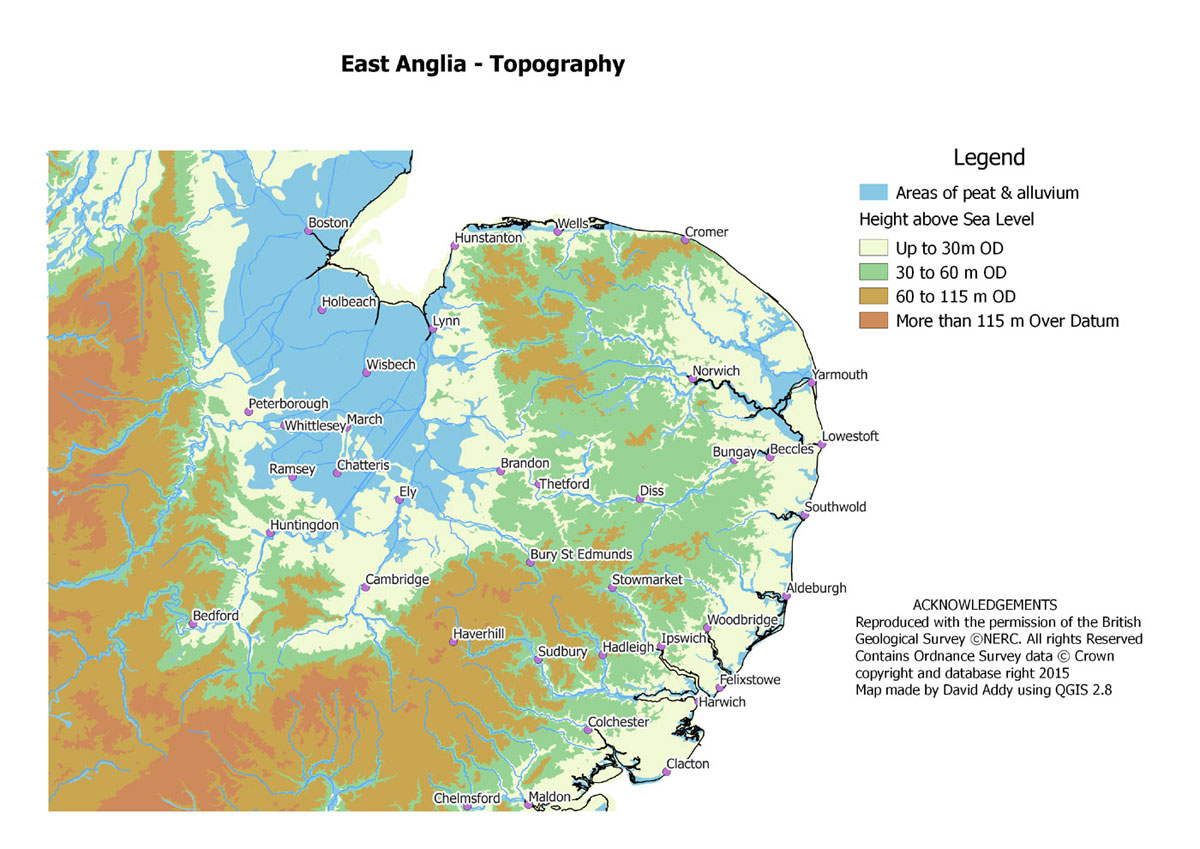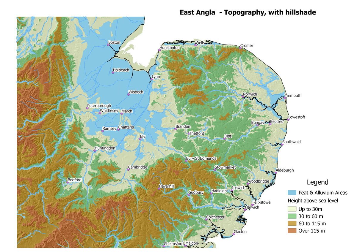 This example of the same map has added a further band of height in order to illustrate where the highest parts of the region are located. There is very little ground above 115 metres in Suffolk.