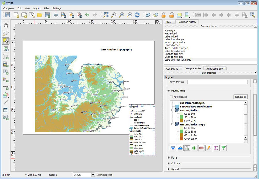 The picture above shows the Print Composer with the overpopulated Legend entries ready for editing.