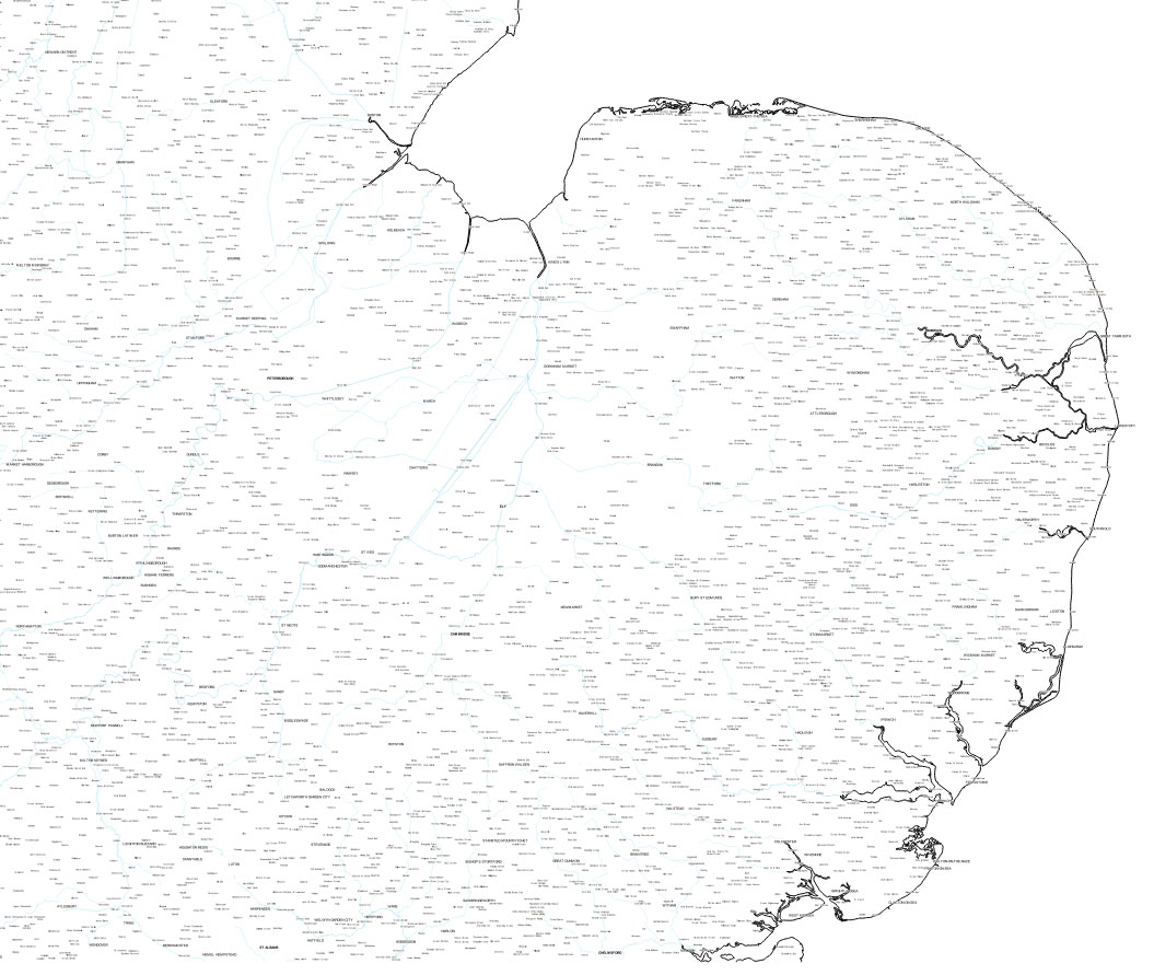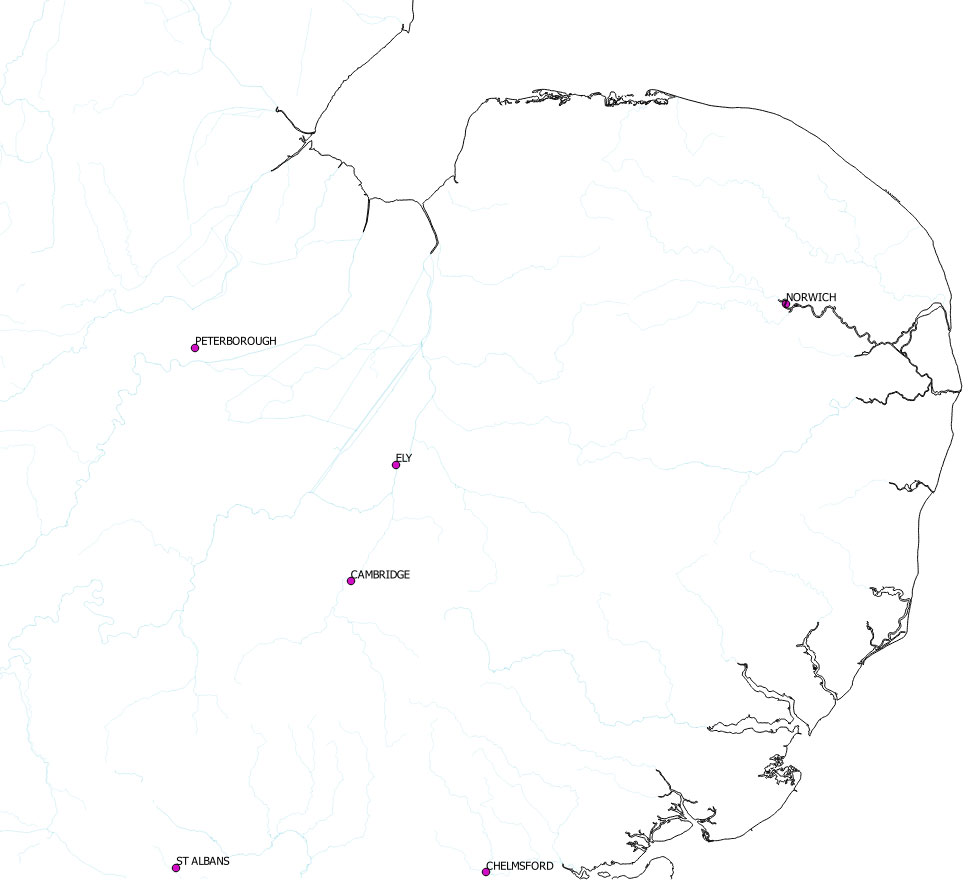 We need to clip the OS Strategi layers called 'coastline', rivers_line, and 'settlement_seed' using our already created clip layer of East Anglia. So load your original OS Strategi files of Britain, and add a copy of the Clip layer. Then for each of these three layers apply 'Vector/Geoprocessing Tools/Clip...', as before. However, do not add them to the Strategi canvas, (ie uncheck the load to canvas box), but navigate to the new location where you are building your topographic map to save East Anglian clipped versions of the files.