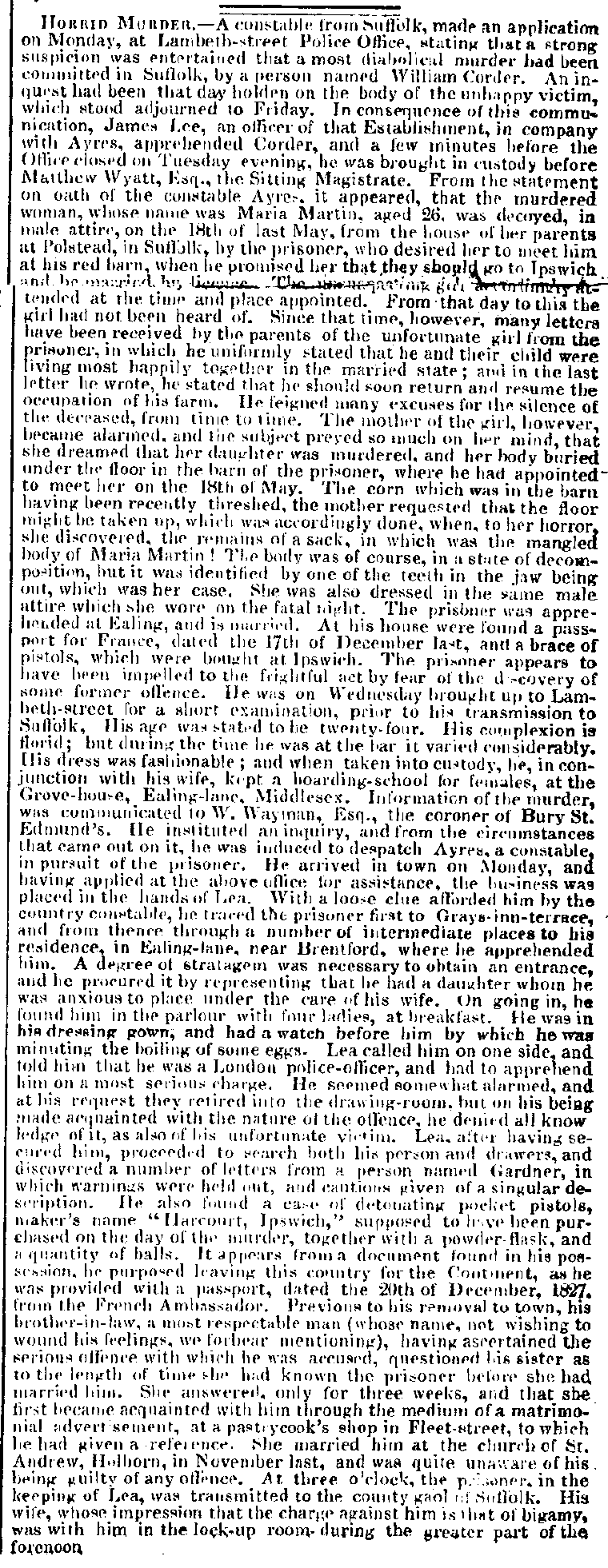 From "John Bull Magazine, Sunday April 27th 1828. HORRID MURDER.- A constable from Suffolk, made an application on Monday, at Lambeth-street Police Office, stating that a strong suspicion was entertained that a most diabolical murder had been committed in Suffolk, by a person named William Corder. An inquest had been that day holden on the body of the unhappy victim, which stood adjourned to Friday. In consequence of this communication, James Lee, an officer of that Establishment, in company with Ayres, apprehended Corder, and a few minutes before the Office closed on Tuesday evening, he was brought in custody before Matthew Wyatt, Esq., the Sitting Magistrate. From the statement on oath of the constable Ayres, it appeared, that the murdered woman, whose name was Maria Martin, aged 26, was decoyed, in male attire, on the 18th of last May, from the house of her parents at Polstead, in Suffolk, by the prisoner, who desired her to meet him at his red barn, when he promised her that they should go to Ipswich and be married by licence. The unsuspecting girl accordingly attended at the time and place appointed. From that day to this the girl had not been heard of. Since that time, however, many letters have been received by the parents of the unfortunate girl from the prisoner, in which he uniformly stated that he and their child were living most happily together in the married state; and in the last letter he wrote, he stated that he should soon return and resume the occupation of his farm. He feigned many excuses for the silence of the deceased, from time to time. The mother of the girl, however, became alarmed, and the subject preyed so much on her mind, that she dreamed that her daughter was murdered, and her body buried under the floor in the barn of the prisoner, where he had appointed to meet her on the 18th of May. The corn which was in the barn having been recently threshed, the mother requested that the floor might be taken up, which was accordingly done, when, to her horror she discovered, the remains of a sack, in which was the mangled body of Maria Martin ! The body was of course, in a state of decomposition, but it was identified by one of the teeth in the jaw being out, which was her case. She was also dressed in the same male attire which she wore on the fatal night. The prisoner was apprehended at Ealing, and is married. At his house were found a passport for France, dated the 17th of December last, and a brace of pistols, which were bought at Ipswich. The prisoner appears to leave been impelled to the frightful act by fear of the discovery of some former offence. He was on Wednesday brought up to Lambeth-street for a short examination, prior to his transmission to Suffolk, His age was stated to be twenty-four. His complexion is florid; but during the time he was at the bar it varied considerably. His dress was fashionable and when taken into custody, he, in conjunction with his wife, kept a boarding-school for females, at the Grove-house, Ealing-lane, Middlesex. Information of the murder, was communicated to W. Wayman, Esq., the coroner of Bury St. Edmund's. He instituted an inquiry, and from the circumstances that came out on it, he was induced to despatch Ayres, a constable in pursuit of the prisoner. He arrived in town on Monday, and having applied at the above office for assistance, the business was placed in the hands of Lea. With a loose clue afforded him by the Country constable, he traced the prisoner first to Grays-inn-terrace, and from thence through a number of intermediate places to his residence, in Ealing-lane, near Brentford, where he apprehended him. A degree of stratagem was necessary to obtain an entrance, and he procured it by representing that he had a daughter whom he was anxious to place under the care of his wife. On going in, he found him in the parlour with four ladies, at breakfast. He was in his dressing gown, and had a watch before him by which he was minuting the boiling of some eggs. Lea called him on one side and told him that he was a London police-officer, and had to apprehend him on a most serious charge. He seemed somewhat alarmed, and at his request they retired in to the drawing-room, but on his being made acquainted with the nature of the offence, he denied all knowledge of it, as also of his unfortunate victim. Lea, after having secured him, proceeded to search both his person and drawers, and discovered a number of letters from a person named Gardner, in which warnings were held out, and cautions given of a singular description. He also found a case of detonating pocket pistols, maker's name "Harcourt, Ipswich" supposed to have been purchased on the day of the murder, together with a powder-flask, and a quantity of balls. It appears from a document found in his possession, he purposed leaving this country for the Continent, as he was provided with a passport, dated the 20th of December, l827, from the French Ambassador. Previous to his removal to town, his brother-in-law, a most respectable man (whose name, not wishing to wound his feelings, we forbear mentioning), having ascertained the serious offence with which he was accused, questioned his sister as to time length of time she had known the prisoner before she had married him. She answered, only for three weeks, and that she first became acquainted with him through the medium of a matrimonial advertisement, at a pastrycook's shop in Fleet-street, to which he had given a reference. She married him at the church of St. Andrew, Holborn, in November last, and was quite unaware of his being guilty of any offence. At three o'clock, the prisoner, in the keeping of Lea, was transmitted to the county gaol of Suffolk. His wife, whose impression that the charge against him is that of bigamy, was with him in the lock-up room during the greater part of the forenoon. From "John Bull", April 27 1828