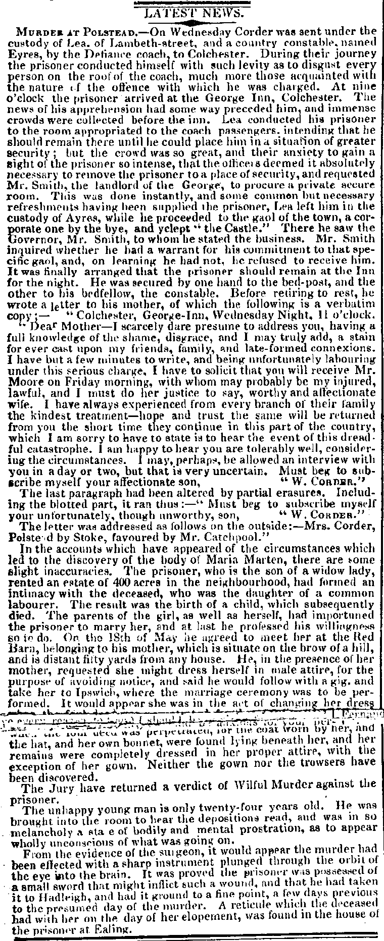 LATEST NEWS. MURDER AT POLSTEAD."On Wednesday Corder was sent under the custody of Lea, of Lambeth-street, and a country constable, named Eyres, by the Defiance coach, to Colchester. During their journey the prisoner conducted himself with such levity as to disgust every person on the roof of the coach, much more those acquainted with the nature of the offence with which he was charged. At nine o'clock the prisoner arrived at the George Inn, Colchester. The news of his apprehension had some way preceded him and immense crowds were collected before the inn. Lea conducted his prisoner to the room appropriated to the coach passengers, intending that he should remain there until he could place him in a situation of greater security ; but the crowd was so great, and their anxiety to gain a sight of the prisoner so intense, that the officers deemed it absolutely necessary to remove the prisoner to a place of security, and requested Mr. Smith, the landlord of the George, to procure a private secure room. This was done instantly, and some common but necessary refreshments having been supplied the prisoner, Lea left him in the custody of Ayres, while he proceeded to the gaol of the town, a corporate one by the bye, and yclept "the Castle." There he saw the Governor, Mr. Smith, to whom he stated the business. Mr. Smith inquired whether he had a warrant for his commitment to that specific gaol, and, on learning he had not, he refused to receive him. It was finally arranged that the prisoner should remain at the Inn for the night. He was secured by one hand to the bed-post, and the other to his bedfellow, the constable. Before retiring to rest, he wrote a letter to his mother, of which the following is a verbatim copy ; " Colchester, George-Inn, Wednesday Night. 11 o'clock.