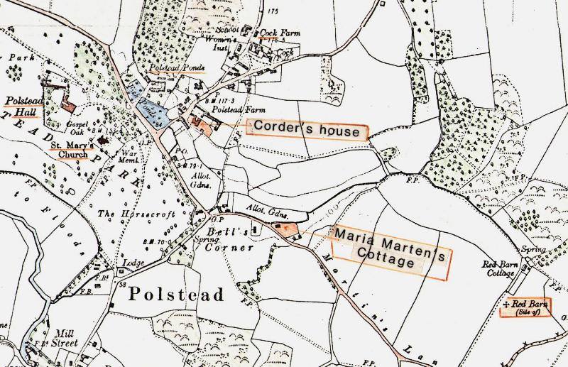 The Red Barn occupied an isolated position on Barnfield Hill, about a mile from Polstead church and half a mile from the Martens' cottage. It was used for storing and threshing the grain after harvest. The Corder family rented it, together with the nearby fields, from Mrs Cooke of Polstead Hall.