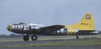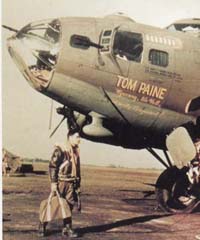 From December 1942 to April 1943 the 322nd Bomb Group (M) flew the medium bomber B-26 Marauder from Rattlesden, until all the Marauder groups were moved to Essex to improve their range over the continent. In November 1943 the 447th flew its B17's from the USA to Rougham, and on to Rattlesden next day. Staff Sargeant Eddie Leighty flew 30 missions with the 447th and in one mission returned with only one of the four engines working. He married a local girl and settled in the village. Planes of the 447th included "The Milk Waggon" and "Fuddy Duddy" and the photographs here are from the collection of Ernest Osborne as are some of the illustrations about the 8th Army Air Force. The 447th flew 257 missions and lost 153 aircraft in action, before flying back to the USA in June 1945. |