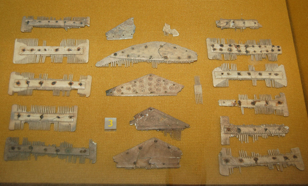 A selection of combs found at West Stow. These combs are made from carved and carefully cut bone. Usually, thin individual layers of bone were rivetted together to give the comb its strength. The remains of 120 combs were found during the excavations, and this may indicate that a small workshop or factory was producing them for trade purposes. |