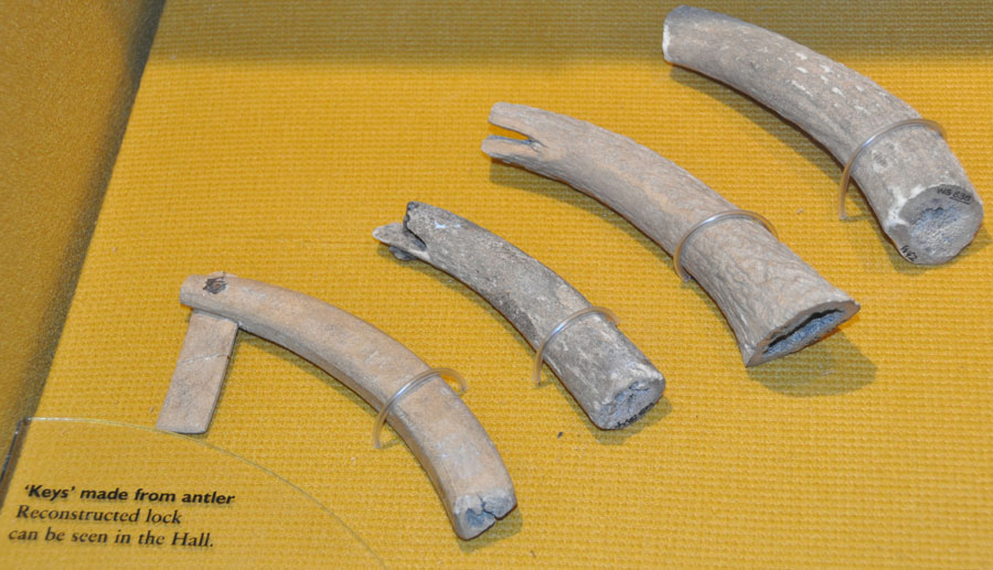 Anglo-Saxon homes had doorlatches which could be opened from outside by the use of these "keys". Made of antler and bone, they folded so they could pass through a small hole in the door, then fall open to lift the latch mechanism. |