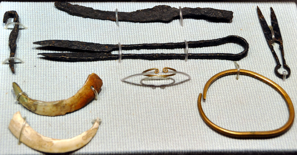 Grave goods from the male burial in grave number 11 excavated at Westgarth gardens in Bury St Edmunds. |