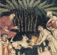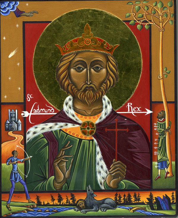 + 116 years | 985 | Abbo of Fleury, who wrote his "Life of St Edmund" at Ramsey Abbey (near St Ives, Cambridgeshire), adds most of the details of the story. Although written over a hundred years after the event, his sources are clearly stated, and, although unusual, must be regarded with respect. Abbo wrote in latin. In a letter to Archbishop Dunstan, Abbo says he heard the Archbishop relate the story and that Dunstan said he heard it as a young man from a very old man who claimed to have been King Edmund's armour bearer at the time of his death. It is likely therefore, that the basics of the story are correct. The account recorded by Abbo is this: Two Danish leaders, Hinguar and Habba, came to Northumbria, which they overran. Hinguar proceeded to the east with a fleet and surprised a city which they sacked ... Eventually Edmund was taken prisoner, whipped and tied to a tree and shot with arrows 'until he bristled with them like a hedgehog or thistle'. He was then beheaded and the head thrown into bramble thickets in Hegelisdun Wood. The date was given as November 20th which remains St Edmunds' Feast Day today. The survivors searched for the head and found it guarded by a wolf and calling 'here, here, here'. The king was buried in a small chapel built for the purpose where the body remained for many years before being moved to Bedericsworth. Abbo also states that Edmund was "ex antiquorum Saxonum nobili prosapia oriundus", a statement which was later to cause other writers to conclude erroneously that Edmund was German. |