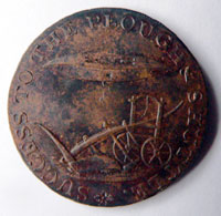 This face showing Bury's arms and this motto, "Success to the Plough and Fleece", also appears on other Bury tokens |