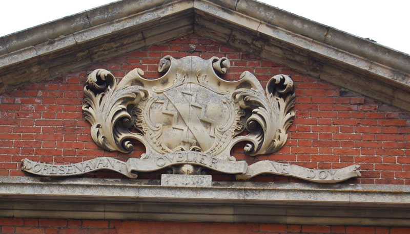 Arms of Dr Poley Clopton Carved by Thomas Singleton in 1750 The motto has been translated as It must not be forgotten henceforth |