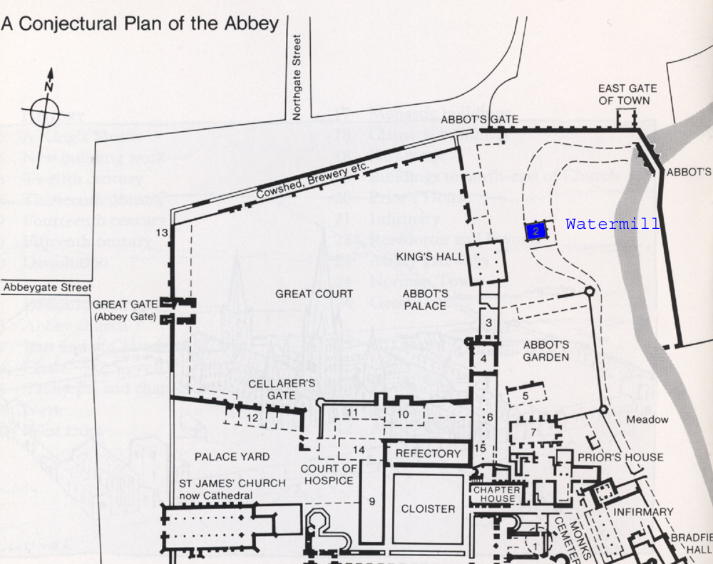 The Abbots Mill, within the Abbey precincts In the Domesday Book, the town of St Edmunds had two mills in 1086, but their locations are unknown. Later we know about the Abbot's Mill and a mill at Babwell. Abbot Anselm is recorded in a charter, quoted by Antonia Gransden, as building a mill in the abbot's court. Anselm ruled the abbey from 1121 to 1148. The location of this mill is shown on the attached plan, marked in blue. It stood between the Dovecote and the Abbots Bridge, on a stream that is no longer in existence.