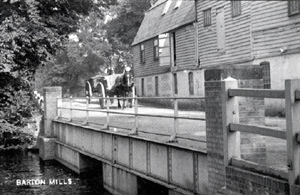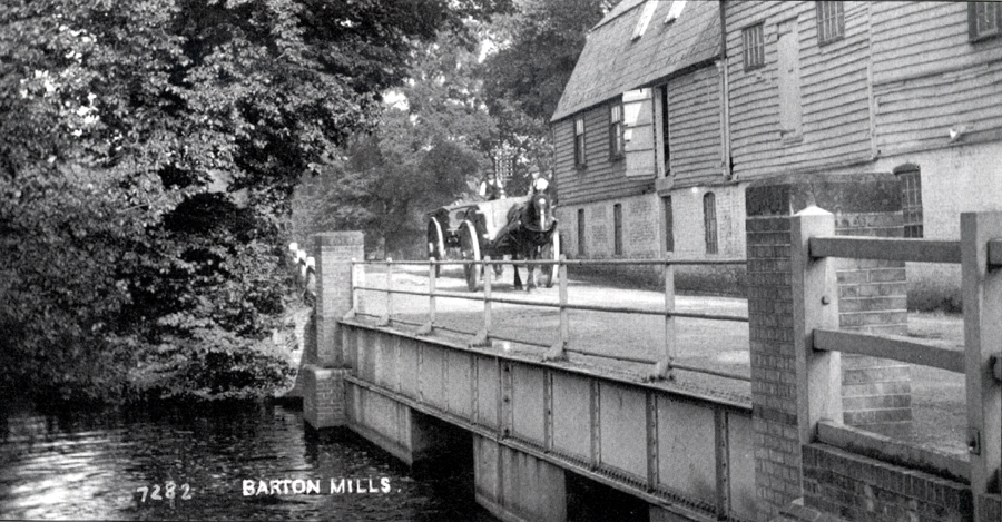 Barton Mills Mill This small village was originally known as Little Barton, but to travellers it became known as Barton Mills. It stood on the main road to Norwich, where it crossed the River Lark. Originally there were two wheels operating seven pairs of stones. The wheels were 12ft by 8ft, and led travellers to remember the mills at Barton. Coaches to Brandon and Norwich could stop at the adjacent Bull Inn. The mill here was probably on a very old mill site, although it is not mentioned in the Domesday Book. By 1893 this mill had already been fitted with a steam engine, but had stood idle for some time. Parker Brothers decided they could do something with it. In 1894 William Howlett noted in the Bury Free Press that the fine old flour mill at Barton Mills had been hired by Parker Brothers of Mildenhall, and fully renovated. The old steam engine was put back into service, and the mill now converted to be a roller mill. This may be the beginnings of Parker Brothers move into flour milling. The River Lark Navigation and all its rights were finally sold to Parker Brothers of Mildenhall, on July 30th, 1902. This allowed them to use the river to service this mill, as well as Icklingham. This mill remained in production until the Second World War. The mill is now demolished, but the mill house remains. |