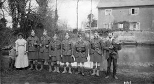 This picture shows six soldiers of the Argyll and Sutherland Highlanders, with the miller and his family in front of Flempton Mill, Suffolk in 1917. The mill was demolished in the 1930s. The mill house was then extended over the site, and over the mill race. The house still stands and the tail race may be seen emerging from the bridge over the road. |