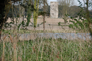 In 1560 a schedule of holdings of the late Sir Thomas Kytson, included the following: In 1817 an Act of Parliament placed the Lark navigation under 80 Commissioners. This Act also consolidated into itself all the provisions of the 1699 River Lark Act, and added several new clauses, some of which were to protect the rights of millers along the river. One provision was specifically in favour of the Duke of Norfolk, who owned the Fornham St Genevieve estate. The ancient site of the Fornham St Genevieve Mill, owned by the Duke of Norfolk, was to continue to enjoy its traditional privileges. The Act continued, "if the same ancient mill had been now existing and in use." The Duke wanted to retain his miller's privileges over the river in spite of the fact that the mill no longer existed. In 1822 John Gage recorded that "Here, (FSG) the prior had a villa and here was a water corn-mill, known in early deeds by the name of the Abbot's Mill." Today there is no trace of this mill, or the others, as the village and its mill(s) was swept away in the 18th century as part of the creation of Fornham Park. This view shows the ruined church across the ornamental lake, viewed from the bank of the River Lark. The former millpond and millstream were dammed and converted into the ornamental canal or lake alongside the River Lark when the park was landscaped in the 18th century. Salmondesforde mill also seems to have become known as Hengrave Mill in later years, as shown below. |