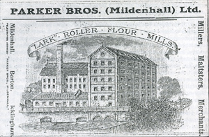 Mildenhall Mills - Lark Mill This mill is recorded in the Domesday Book, and dates back to before 1066. In 1722 there was a dispute between Mr Ralph at Mildenhall Mill, and Henry Ashley, the owner of the Navigation rights on the River Lark. Ralph seems to have had a string of grievances, but he was now threatening to pull up the Mildenhall Lower Staunch. He felt that he was not getting enough water to drive his mill. Ashley had avoided such disputes at Icklingham by buying the mill himself, and at Chimney Mills by taking on a long lease. Lark Mill had steam power introduced in 1868, and some time later the water wheel was replaced by water turbines. In 1887 the old wooden Lark mill was replaced by the large steam and water driven roller mill illustrated here. Roy Silverlock noted that it was reported as "the most important event in the locality", in Simpson's Retrospect for 1887. Simpson was a Mildenhall printer and publisher. By 1890 it was called the Lark Roller Mills, run by Mr Owers, who retired in 1897. In 1897 Lark Mills were taken over by Parker Brothers, who already kept the mill at Barton Mills, and would remain with that family until the late 20th century. In November, 1901 the expanding firm of Parker Brothers re-opened the Mildenhall Mill. The River Lark Navigation and all its rights were finally sold to Parker Brothers of Mildenhall, on July 30th, 1902. From 1919 to 1936 a dynamo driven by Parkers' mill supplied electricity to parts of Mildenhall.