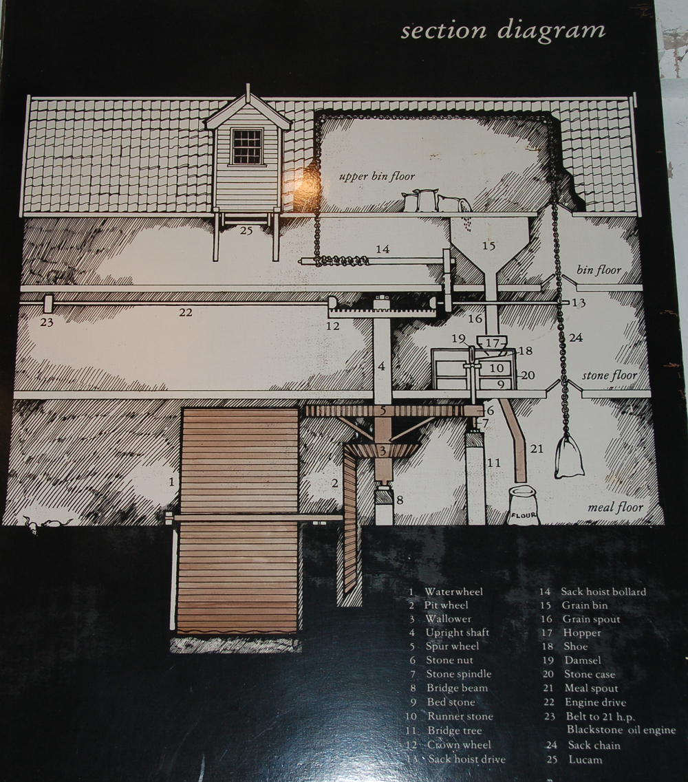 Pakenham Information Board 4 Diagrammatic section through Pakenham Watermill Showing how power is taken from the wheel, through various gears, to grind corn. |
