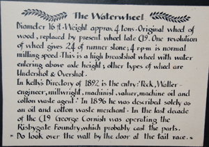 Pakenham Information Board 5 Details of controlling water supply to the wheel, which is a "breasthot" wheel. Before 1814 the wheel was the inefficient undershot design. In 1814 Charles Lowe installed this new design, and had to build up the banks of the mill pond to raise the water level to the right height. The 1814 wheel was made of wood and iron, and needed replacing by 1898. |