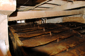 Pakenham Water wheel is 16 feet high, and is the source of the mill's power. Each spoke bears the impress 'W PECK BURY'. This cast iron wheel was originally designed by Walter Peck, millwright of Sparhawk Street, Bury St Edmunds, and cast at Cornish and Lloyd's foundry in Risbygate Street, Bury, in 1898. |