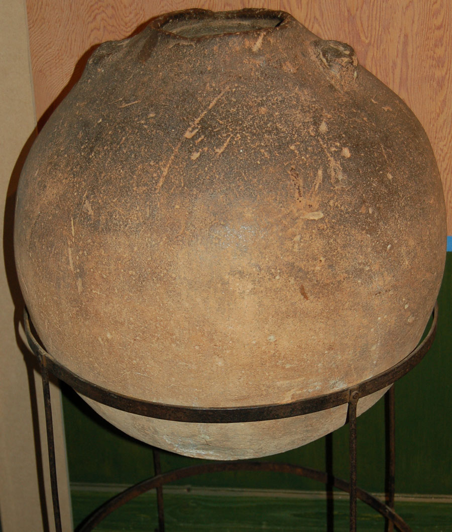Globular Amphora from Hawkedon. It is Roman, from the 2nd century AD, and originally held olive oil from southern Spain. When found in 1880 it contained two figurines of the goddess Venus, and may have been used as a cremation urn. |